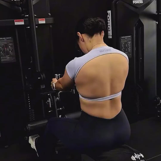 Vibe: Highlights the open-back design and breathability for high-impact workouts.